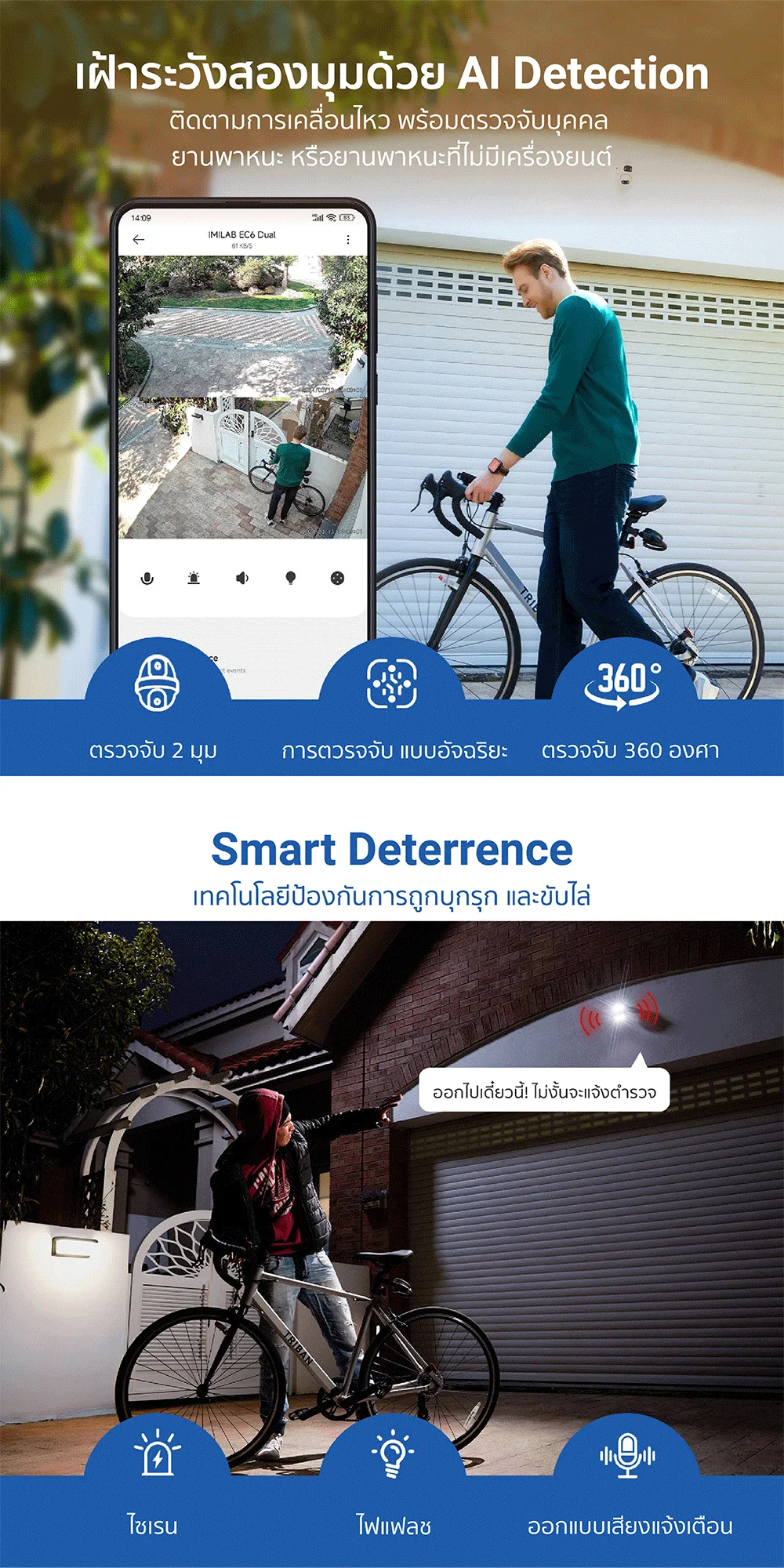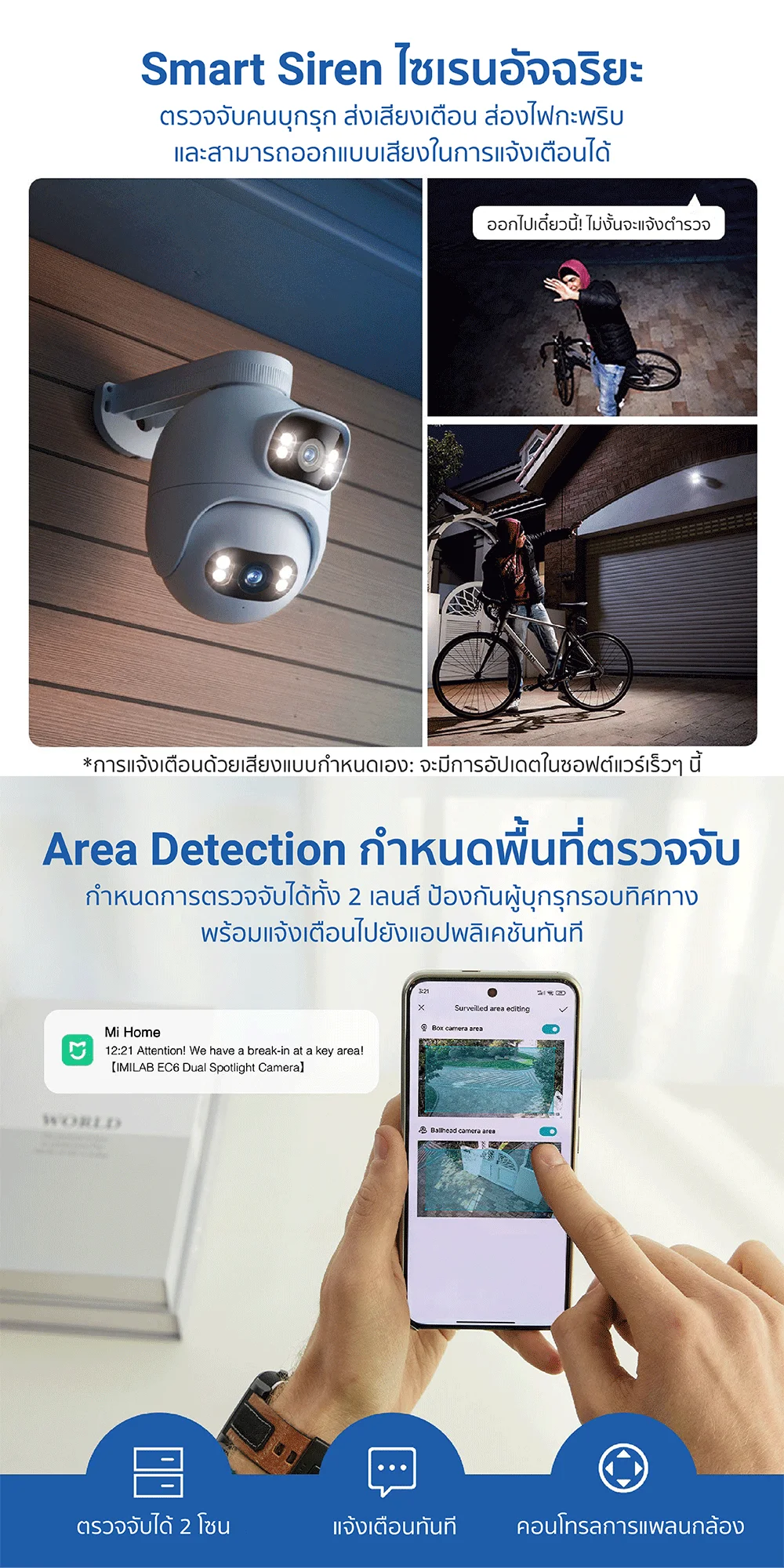 - Smart Siren & Spotlights: ตรวจจับคนบุกรุก ส่งเสียงเตือน ส่องไฟกระพริบ