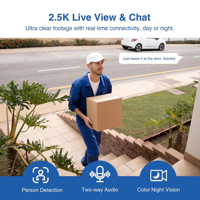 - Two-way audio with built-in microphone and speaker for communication.